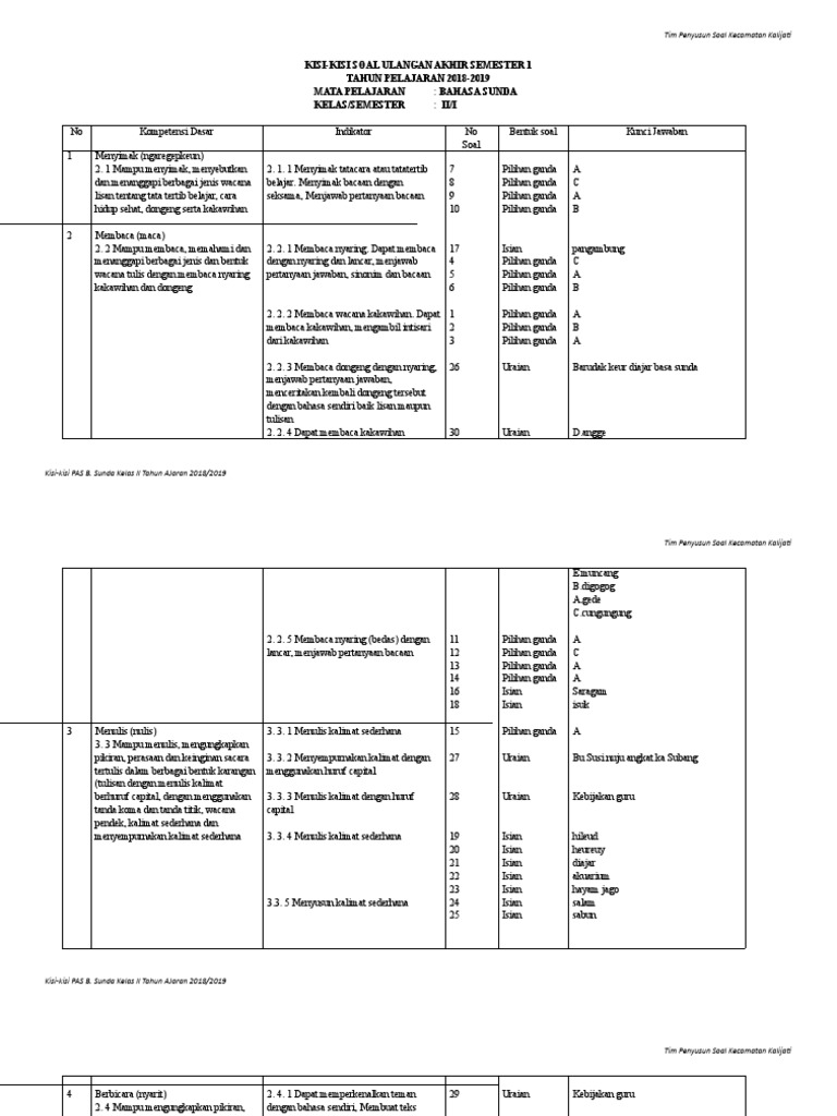 Pas (penilaian akhir semester) istilah penilaian yg dilakukan diakhir semester setelah kegiatan pembelajaran selama 1 semster atau 6 bulan. Adapun materi yang tercakup pada kisi kisi soal b. Kecap nu di rarangkenan tukang 6. Kecap serapan tina basa walanda 4. Materi anu dibahas dina kunci jawaban bahasa sunda kelas 4 nyaeta diantarana ngeunaan tatakrama basa sunda, pakeman basa, fungsi kalimah nyaeta kalimah parentah, nyusun kalimah, sarta surat. Sunda kelas 2 semester gasal ini meliputi : Contoh soal cpns 2018 soal pts uts bahasa sunda kurikulum 2013. Kunci jawaban tematik kelas 5 tema 1 semester 1 ini juga dilengkapi dengan materi dan tema gambarnya adalah hewan kesayanganku. Soal dan jawaban pas kelas 4 semester 2 (genap) kurikulum 2013 (k13). ꦧꦱꦗꦮ ) adalah bahasa yang digunakan penduduk bersuku bangsa jawa di jawa tengah, yogyakarta, dan jawa timur. Soal uas/pas ips kelas 4 sd/mi semester 1 dan kunci jawaban cara menghitung perkalian cepat 7 detik live uas siang hari ini 17 februari 2019! Muatan pelajaran pada soal tematik kelas 5 adalah ipa, ips, pkn, seni budaya dan budi pekerti, serta bahasa indonesia. Kelas 8 semester 1 kurikulum 2013 kunci jawaban dan.